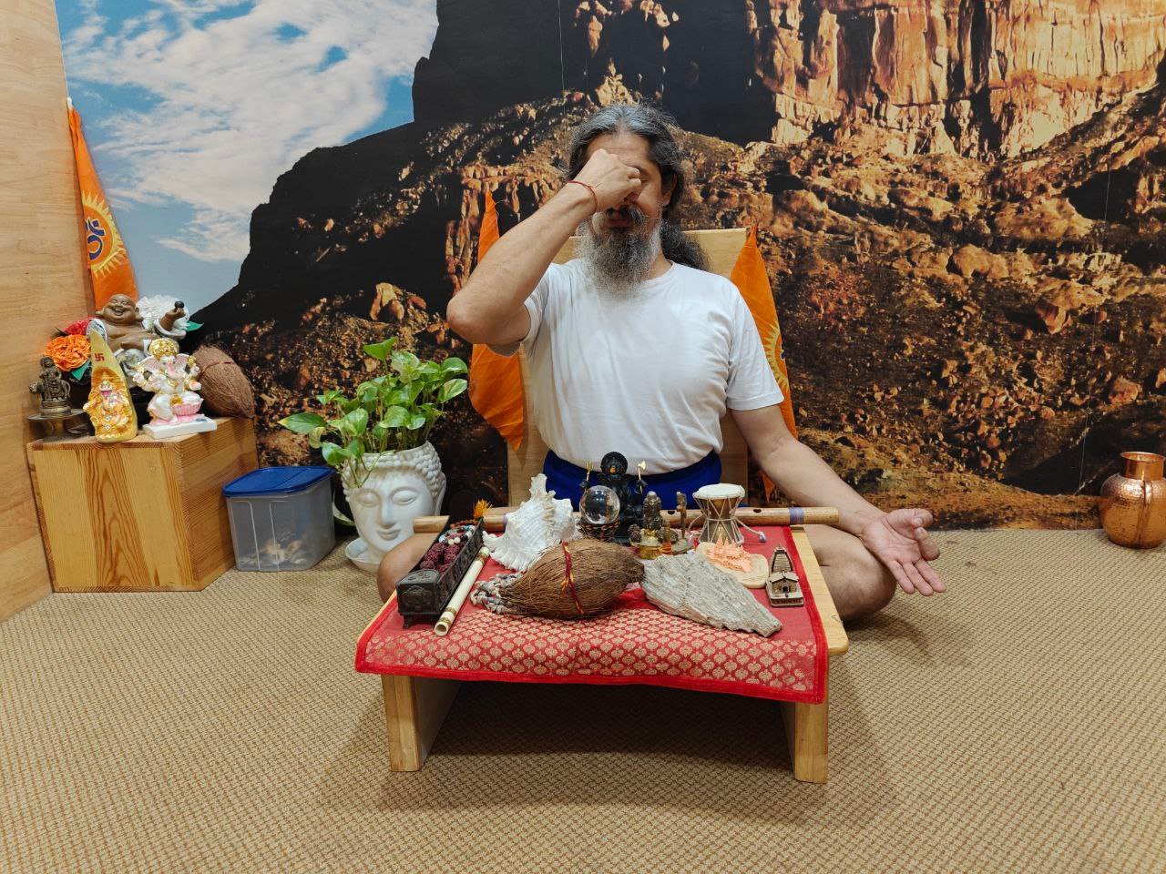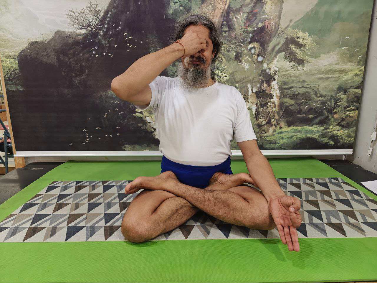 - दाहिने हाथ का अंगूठा दाहिनी नासिका पर,